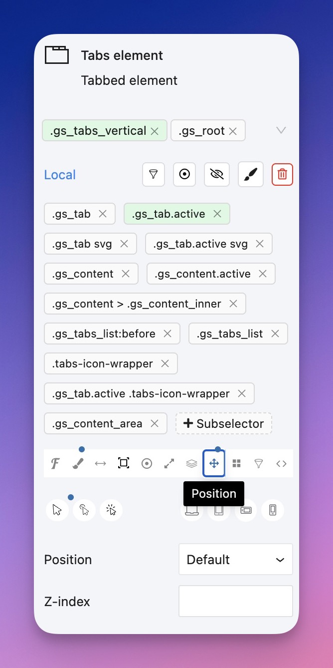 If you want to change design of tabs, select most parent block and then click on .gs_tabs_vertical class. You will find design for all sub elements inside it. Please, note, this template uses modern Anchor API that is partially supported in Firefox and Safari. So, check Position options for .gs_tabs.active selector. It has fallback styles for cases when Anchor API is not supported in browser